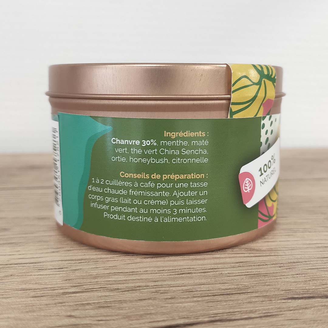 Composition : 30% chanvre, menthe, maté vert, thé vert China Sencha, ortie, honeybush, citronnelle